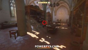 从修道院南侧走廊的大门进入图书馆。你需要拿起一本名为“玫瑰园”。从进入图书馆的地方稍微向左转,可以看到两排书架,中间有小桌子。书在左边第一个书架上,在书架下部的小木板上(不是从书架里面抢到的)。