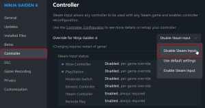 - 在 控制器 选项卡,选择 禁用蒸汽输入 下的选项 覆盖《忍者龙剑传 4》